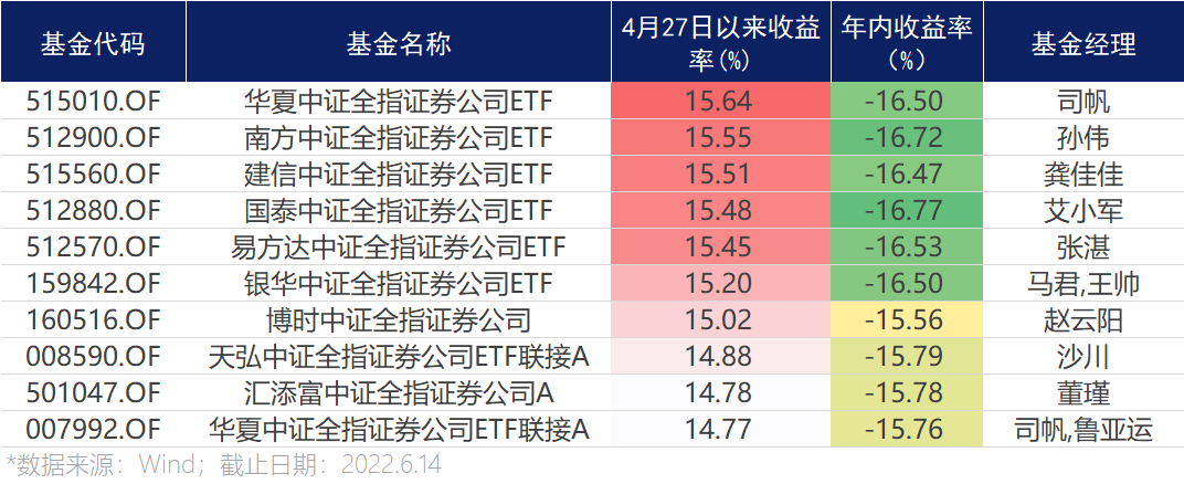 其中, 华夏中证全指证券公司ETF、 南方中证证券ETF、 建信中证全指证券公司ETF、 国泰中证证券ETF、 易方达中证证券ETF、 银华中证全指证券公司ETF、博时中证800证券公司这几只基金回血相对较大,区间涨幅(4月27日至6月14日)均超15%。