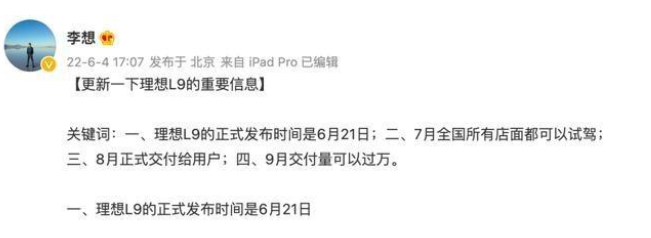 理想汽车CEO李想日前也在社交平台发布了新车理想L9的最新消息,并称其为500万以内最好的家用旗舰SUV。据悉,理想L9将于6月21日首发,7月全国门店都可以试驾,8月正式交付用户。