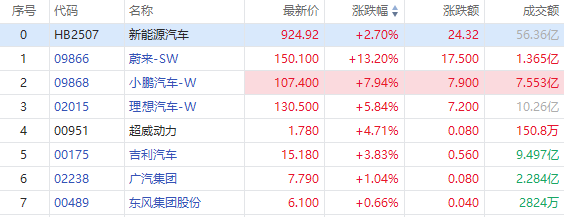 6月15日,港股新能源汽车股今日拉升走高,蔚来盘中一度大涨16%。截至发稿,蔚来涨13.2%,报150.1港元每股,小鹏汽车涨7.94%,理想汽车涨5.84%,吉利汽车、广汽集团、长城汽车跟涨。