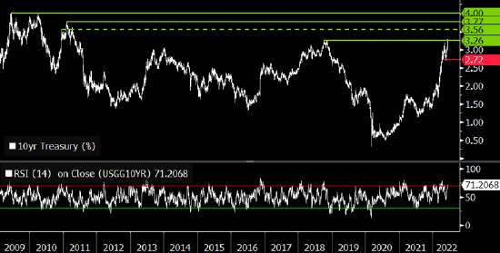 若债市反弹、收益率跌破3.26%,初始目标位将是4月创下的收益率低点2.72%。14天相对强弱指数(RSI)动量震荡指标刚超过70,或成为进一步抛售的阻力。不过,4月时RSI在70以上维持了两周时间才开始缓和。