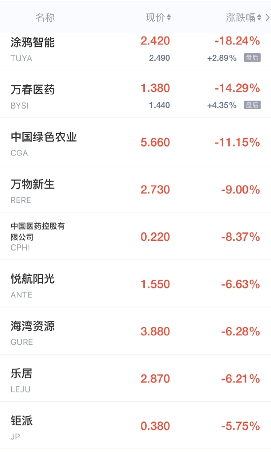 涂鸦智能跌超18%,万物新生跌9%,乐居跌超6%,寺库跌近5%,怪兽充电、水滴公司、荔枝跌超4%,网易、爱奇艺、BOSS直聘、途牛跌超2%,雾芯科技跌近2%,拼多多、高途、中通、携程跌超1%,一起教育、网易有道跌近1%。