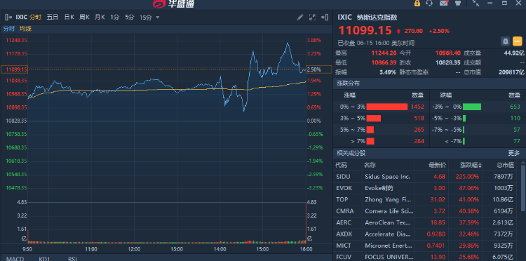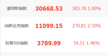 道指涨303.70点,涨幅为1.00%,报30668.53点;纳指涨270.81点,涨幅为2.50%,报11099.15点;标普500指数涨54.51点,涨幅为1.46%,报3789.99点。