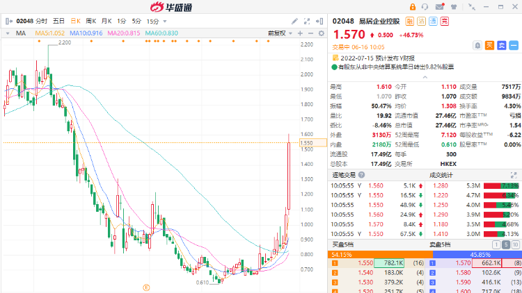 华盛资讯6月16日消息,房地产交易服务商易居企业控股盘中短线拉升近50%,截至发稿,报1.57港元/股,最新总市值27.46亿港元,暂成交9834万港元。值得注意的是,该股连续三个交易日上涨,股价接近翻倍。