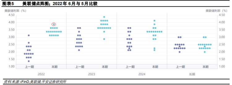 根据本次会议后的点阵图显示,利率走势先升后降。2022 年的利率预测均处于 3%-4%区间较为集中,分歧相对较小。年内政策利率终点将达到 3.375%,这意味着2022年还有175个基点的加息幅度。