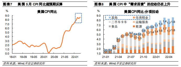 美国5月CPI数据超预期走高 ,同比达到8.6%,打破了华尔街“通胀见顶论”。从分项数据看,排除能源、食品以及供给因素更相关的二手车卡车、运输服务分项后,剩余部分(包括住房租金以及“其他”)对通胀率的拉动仍在上升。
