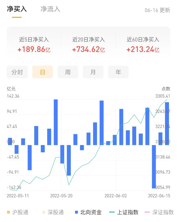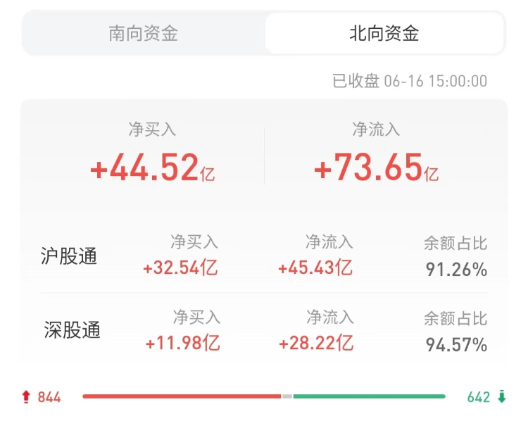 北上资金今日净买入44.52亿元,沪股通净买入32.54亿元,深股通净买入11.98亿元。上一交易日净买入133.59亿元。