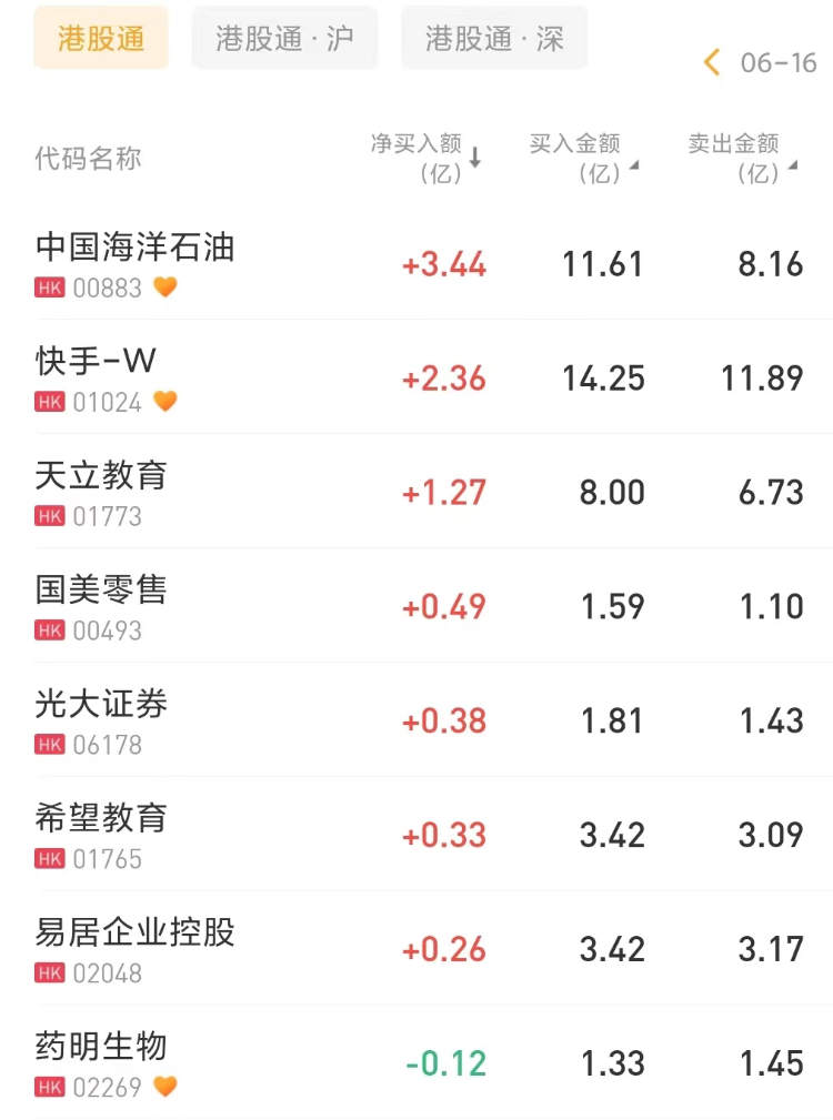 南下资金净买入中国海洋石油3.44亿港元,为今日买入之最。此外,南下资金净买入快手-W 2.36亿港元,净买入天立教育1.27亿港元。