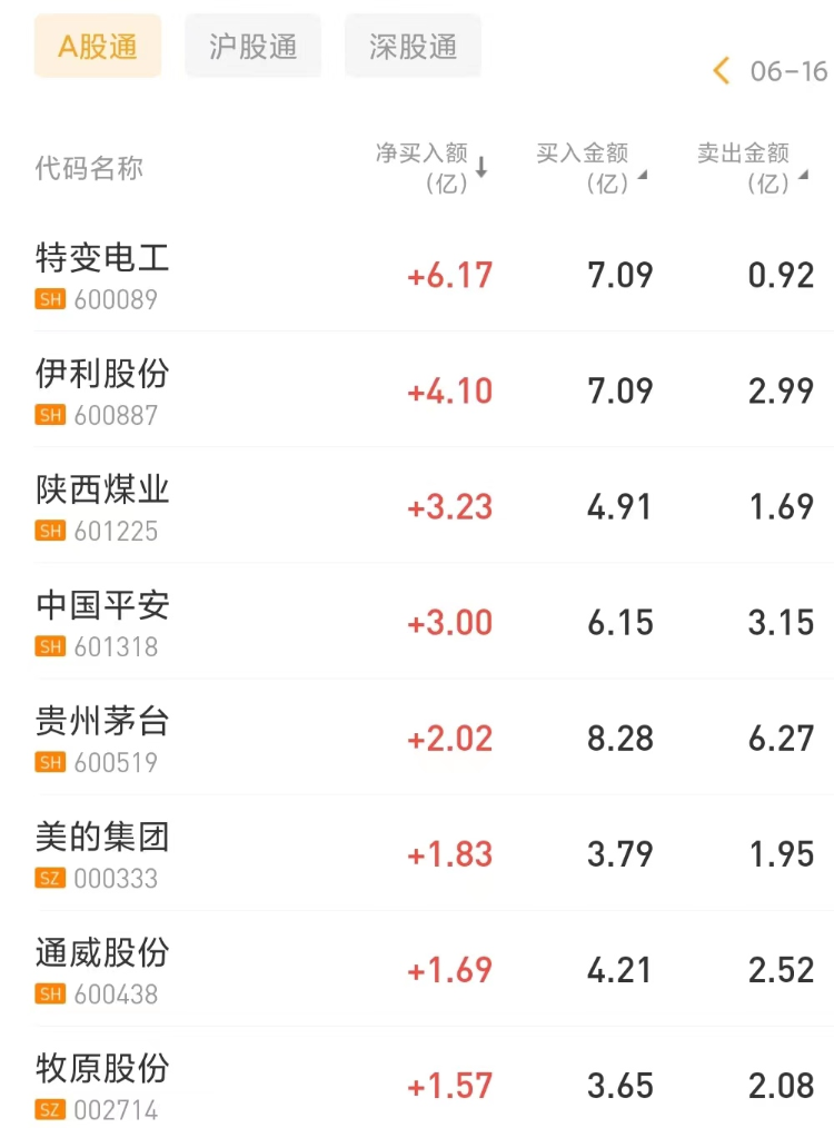 北上资金今日净买入特变电工6.17亿元,为今日买入之最;净买入伊利股份4.1亿元。