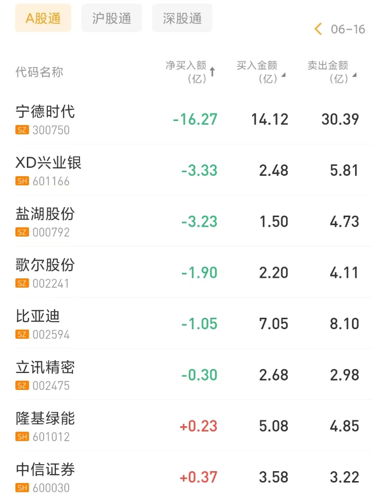 今日北上资金净卖出宁德时代16.27亿元,兴业银行遭净卖出3.33亿元。