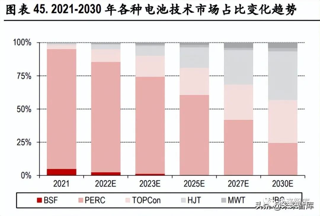N 型电池渗透,石英坩埚用高纯砂需求无忧:与 P 型电池相比,N 型电池具有转换效率高、双面率高、 温度系数低、无光衰、弱光效应好、载流子寿命更长等优点。目前,P 型 PERC 电池逐渐迫近效率天 花板,而 N 型电池效率天花板较高,未来转换效率提升空间较大。随着 N 型电池工艺和效率的不断 优化,N 型电池中技术相对成熟的 HJT 和 TOPCon 渗透率将进一步提升。根据 CPIA 数据,HJT 和 TOPCon 的市场份额将由 2020 年的 4%提升至 2030 年的 36%。在光伏硅片中,P 型硅片单晶纯度<200ppm、N 型单晶硅片纯度<100ppm 。为满足 N 型硅片对纯度的更高要求,拉制 N 型硅棒的石英坩埚需要增加 更换的频率以减少杂质的累积,因此 N 型单晶石英坩埚的更换频率高于 P 型单晶坩埚,更换次数提 升有望驱动石英坩埚用高纯砂需求提升。