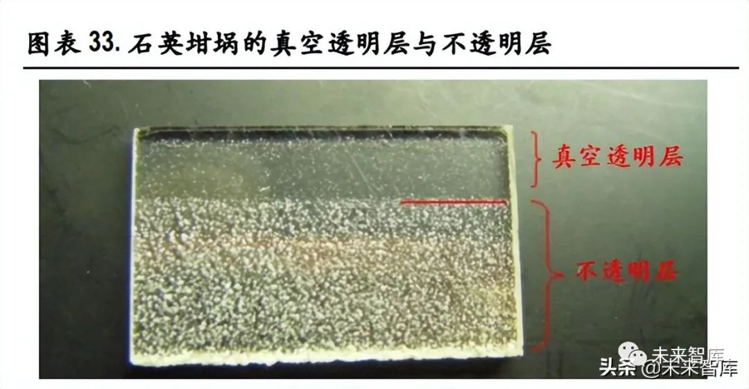 石英坩埚呈现内外双层结构:早期的石英坩埚是全透明的结构,这种透明的结构容易导致不均匀的 热传输条件,增加晶棒生长的难度,且均匀的结构对高品质的高纯石英砂需求较大,成本较高,因 此这种石英坩埚的制备方法基本被淘汰。电弧法制备的石英坩埚为半透明状,有内外两层结构,外 层是高气泡密度的区域,称为气泡复合层。气泡复合层受热较均匀,保温效果较好;内层是一层 3-5mm 的透明层,称为气泡空乏层。气泡空乏层的存在使坩埚与溶液接触区的气泡密度降低,从而改善单 晶生长的成功率及晶棒品质。