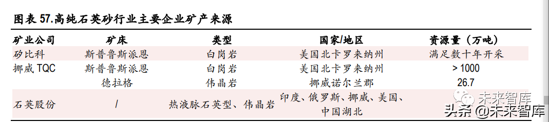 3)石英股份:2009 年,石英股份成功攻克了高纯石英砂提纯技术难题,实现了高纯石英砂规模化生 产。目前,石英股份高纯石英原料主要来源于印度、挪威、俄罗斯和美国的进口石英砂,以及部分 高质量国产石英矿。