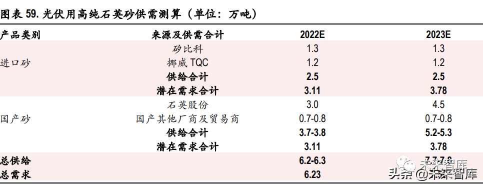 2022-2023 年高纯石英砂供需或偏紧:根据矽比科、挪威 TQC、石英股份等现有国内外企业产能和扩 产规划,我们预计 2022 年光伏用高纯石英砂可能的供给量范围在 6.2-6.3 万吨,对应 6.2 万吨的需求, 供需或处于紧平衡状态;2023 年光伏用高纯石英砂可能的供给量范围在 7.7-7.8 万吨,对应 7.6 万吨的 需求,供需或仍将处于紧平衡的状态。其中,进口砂供应量在 2.5 万吨,对应 2022-2023 年的 3.1 万吨 和 3.8 万吨的需求更显紧俏。在紧张的供需格局下,高纯石英砂存在持续涨价的可能。此外,随着 下半年硅料新增产能的逐步释放,硅料价格松动有望推动拉晶厂商开工率提升,从而带动光伏石英 坩埚用高纯石英砂需求的快速上升,光伏用高纯石英砂在季度拉晶需求波动的过程中可能会出现阶 段性的短缺,届时高纯石英砂价格仍有短期上涨的可能性。