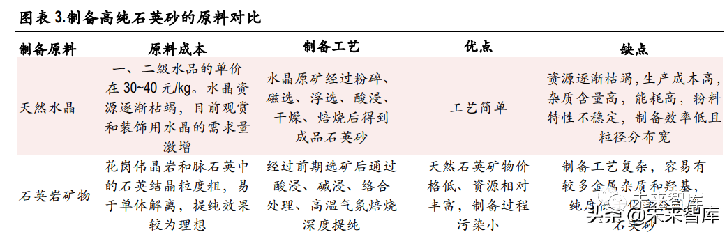 合成石英砂崭露头角:随着全球范围内天然水晶和高品质石英矿脉的逐渐枯竭,化学合成生产高纯 石英得到重视。此外,合成石英材料因为其纯度更高、光学性能更良等特性,除了在高端光学领域 得到广泛应用以外,也符合半导体制程对石英制品高纯、无污染、耐高温的要求,尤其是随着半导 体芯片线宽越来越窄,普通的天然石英材料已经无法满足高端生产工艺的要求,合成石英成为 10nm 制程以下的半导体芯片刻蚀环节中的重要部件。光掩模版需求旺盛,也带动合成石英材料的需求。目前全球高纯合成石英材料主要生产企业包括美国康宁公司、德国贺利氏、日本东曹株式会社、日 本信越石英株式会社以及国内的菲利华。(报告来源:未来智库)