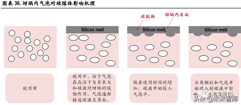 3)气泡(气体包裹体)含量:气泡(气液包裹体)主要由结晶水和气组成,气的成分主要有 CO2、 H2O、H2O2、N2、CH4、CO。在坩埚使用过程中,由于与硅液接触的内表面不断向硅液中熔解,并且 伴随着透明层中的微气泡不断的长大,靠近最内表面的气泡破裂,伴随着硅液释放石英微颗粒以及 微气泡。而这些杂质会以微颗粒以及微气泡的形式伴随着硅液流遍整个硅熔体,直接影响到硅的成 晶(整棒率、成晶率、加热时间、直接加工成本等)以及单晶硅的质量(穿孔片、黑芯片等)。目 前,通过使用低气泡密度的高纯度石英砂作为石英坩埚的内层,可有效减少内表面气泡破裂现象, 为长时间拉晶(如多次复投料)提供保障。