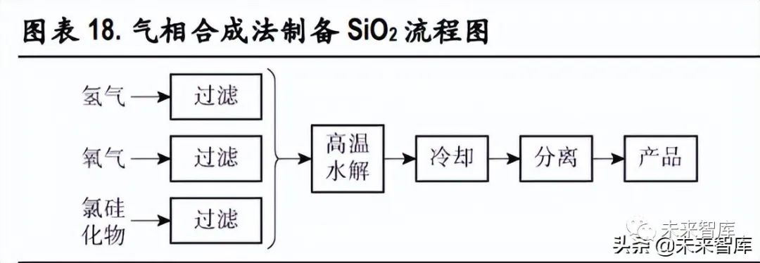 1)气相合成法:即火焰水解法,与气相白炭黑工艺类似,其原理是采用硅或有机硅的氯化物(如 SiCl4 或 CH3SiCl3等) 作为原料,将其气化后与氢气、氧气混合,在高温下发生水解形成雾状的 SiO2,最 后通过冷却、分离、脱酸等气固分离得到产品。该法得到的产品为气相 SiO2,粒径小于 100nm,外 观蓬松多孔,比表面积大,化学纯度高,分散性较好。工艺特点:生产流程简单,合成条件易控制,反应速度快,适合大规模生产;由于过程中需要高温 环境,反应生成的 HCl 会严重腐蚀设备,因此对生产设备的材质、加热形式等要求比较严格。由于 气相法耗能大,加工成本较高,还需在反应条件与设备选型等方面进一步探讨和研究。