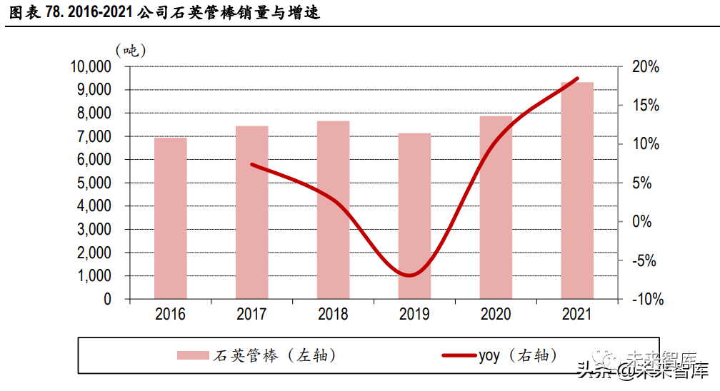 石英管棒出货量稳定增长,新增产能加速落地:公司石英管棒销量稳步提升,2021 年实现石英管棒 销量 9326 吨,同比增长 18.47%。公司加速推动石英管棒新增产能落地,6,000 吨/年电子级石英产品 项目预计 2022 年 10 月达产;1,800 吨/年的石英砣项目进展顺利,已建成投产。