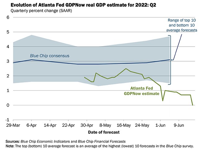 6月15日,据美国亚特兰大联储GDPNow预测模型最新数据显示,美国二季度实际GDP增长率(经季节调整的年化增长率)可能仅为0.0%,低于6月8日的0.9%,这可能表明美国正逐步接近经济衰退的边缘。