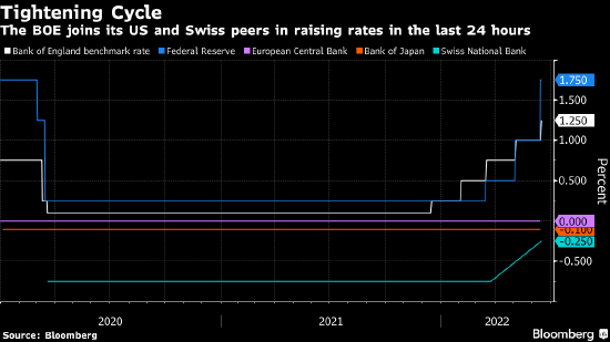决议公布后的几分钟内,投资者就押注英国央行将不得不采取更激进的措施来遏制通胀。迄今为止,行长贝利一直行动谨慎,凸显出经济衰退的风险。现在,他可能不得不跟上美国迅速行动的步伐。
