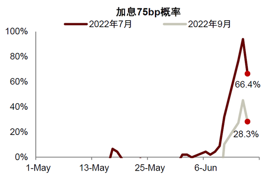 图表:期货市场预期2022年7月和9月美联储加息75bp概率有所回落