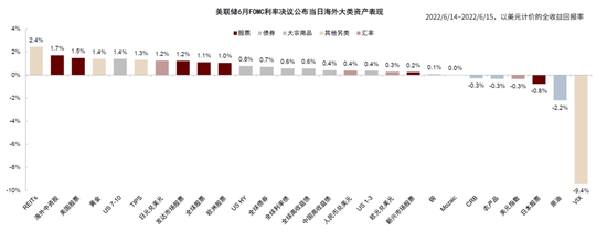 与此同时,会议决议删除了“强劲的劳动力市场、家庭支出与投资”等文字,下调GDP增长预期,转为强调要坚决(“strongly committed to”)把通胀控制在目标水平。这说明在5月份通胀数据远超预期背景下,美联储决心以经济增长为代价快速控制通胀。我们认为美国货币政策激进收紧,或将造成更多增长压力,导致海外经济衰退风险进一步抬升,“滞胀交易”以“衰退交易”收场的概率升高(《大类资产2022H2展望:滞胀交易的下一站》),避险资产配置价值上升。