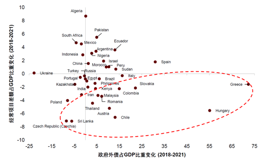 图表:与2018年相比,大部分新兴市场外债更高,经常账户更低,面临流动性冲击可能更加脆弱