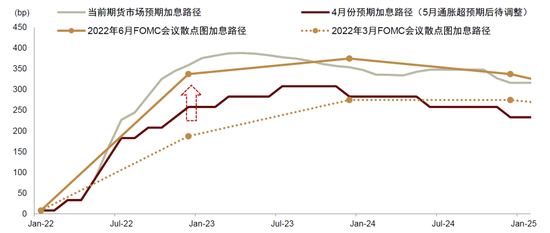 但由于5月通胀数据创出新高,远远超出我们与市场预期,美国通胀下行拐点推迟,导致联储加息路径明显上调,短端利率预期大幅调整,因此我们需要上调2022年底十年期美债利率点位预测。我们把散点图反映的加息路径对未来10年求平均,然后与期限溢价加总,可得十年期美债利率2022年底的均衡价格在3%左右,低于当前市场定价3.4%。与此同时,目前美联储货币政策激进收紧,可能导致经济下行压力更大,2023-2024年衰退风险更高。今年加息越激进,可能明年降息越积极,我们认为美联储政策利率路径存在下行调整风险。下半年增长担忧深化,市场可能开始回调2023-2024年的加息预期,导致十年期美债利率筑顶回落,大涨之后或有大跌。