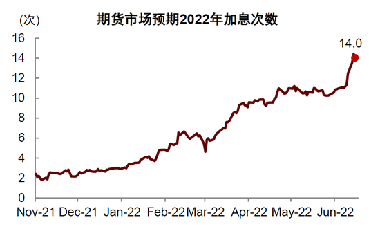 图表:期货市场预期2022年加息次数增至14次(按每次25bp计算)