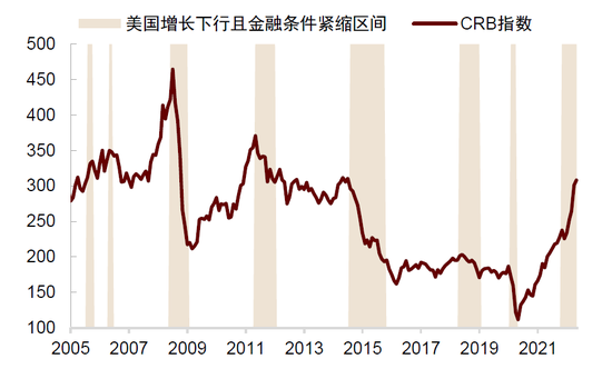 图表:金融条件收紧、增长下行的时期,商品往往表现不佳
