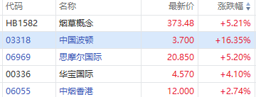 华盛资讯6月17日讯,港股烟草概念股拉升,中国波顿涨超16%,思摩尔国际涨超5%,华宝国际涨超4%。