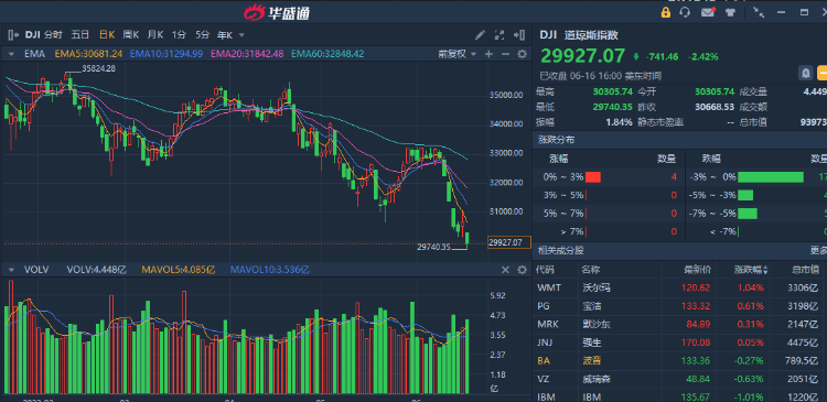 而继此前纳指和标普500指数先后入熊后,道指目前较历史高位的跌幅也达到了逾19%,逼近技术性熊市区域。