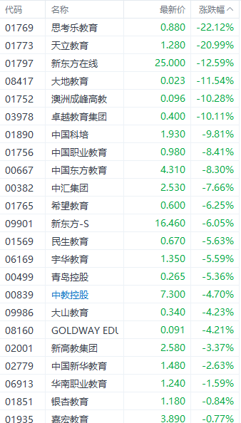 教育股多数回调 新东方在线转跌