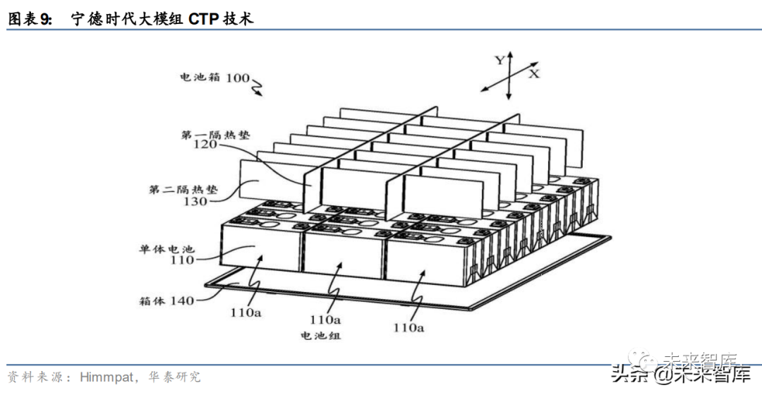 CTP 的公司进展和专利布局 CTP 方案直接将单体电芯组成一个或几个阵列(模组),安装到电池包中,大幅减少了模组 的数量,免去了先形成模组再安装成电池包的过程和其中的成本,形成电池包后可安装至 新能源汽车上。使用 CTP 技术后,提高了电池包的空间利用率,提升了体积能量密度,减 少了不必要的模组零部件,但对技术能力的要求提高,安全性能不如模组叠加的组合方式。