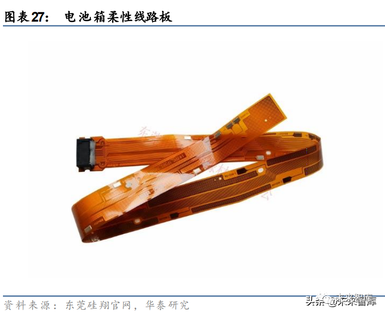 在 MTP 电池包里,FPC(柔性电路板)替代铜线线束作为单独的零件对电池电压进行监测。随着 CTP 技术渐成主流,FPC 不再做单独的零件,而是与铜铝排和线束板结构件集成在 CCS 里,成为 CCS 的一部分。FPC 及 CCS 的单车用量与电池模组设计相关,每一个电池 模组配套一套 CCS,每套 CCS 配套 1-2 条 FPC。目前许多 FPC 厂商进一步向下游 CCS 产品布局,通过 FPC 向 CCS 的拓展提升单车价值和盈利空间。参考相关企业招股说明书 所披露信息进行计算,FPC 的产品单价在 60 元左右,按照主流电动车配置的 7-12 个电池 模组用量,则动力电池带来的 FPC 的单车价值量为 420-720 元左右。由于每套 CCS 配置 1-2 条 FPC,并且包含塑胶结构件、铜铝排等结构,判断 CCS 的单车价值是 FPC 的 2-3 倍,则 CCS 的单车价值预计为 840-2160 元。