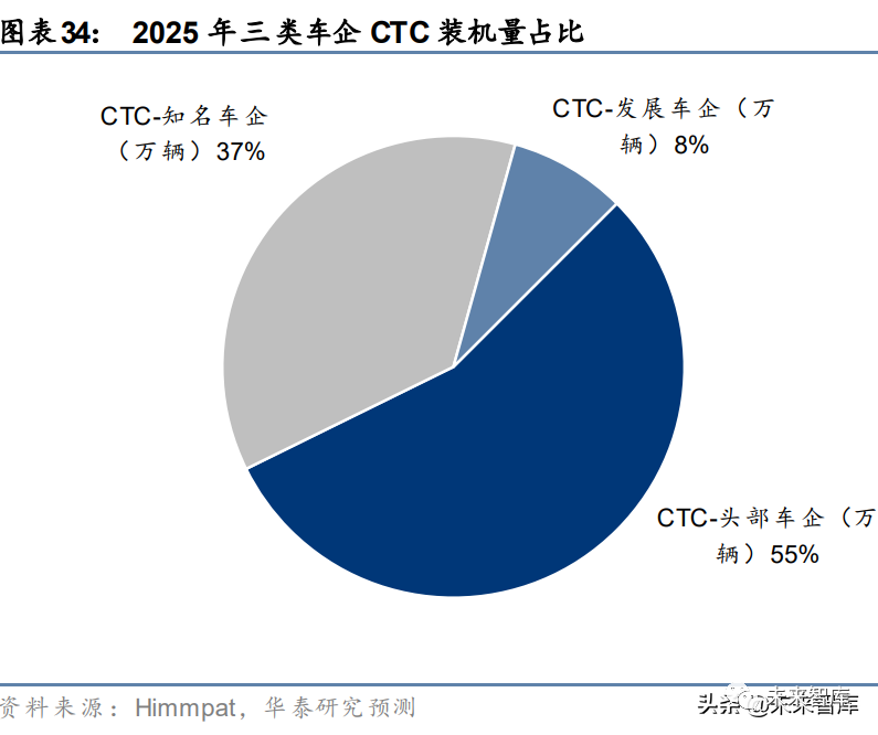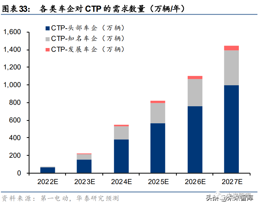 我们认为,随着整车对于电池系统综合性能要求越来越高,CTP 的渗透是一个确定性比较 高的过程。从技术维度来说,CTP 主要是一次系统结构升级,修改的重点是电池的排布方 式、主体零件尺寸变大和非关键零部件的削减,就现在市场份额逐步提升的实际情况来看, 越来越多的市场使用数据,将有效反馈完善设计方案。从商业模式上来说,在满足整车外 部尺寸包络曲线的大前提下,CTP 产品引发的产业变化主要发生在电池公司的内部,不存 在新的产业环节的引入,是一个内部自协调的过程。因此我们预计到 25 年,CTP 将会成为 主流的电池系统设计方案。同时 CTC 方案也在不断渗透,预计 2024 年,CTP 和 CTC 渗 透率总和将超过 90%。(报告来源:未来智库)