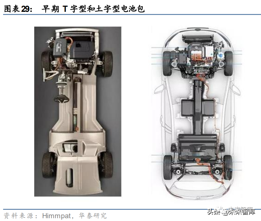 早期的电动汽车采用分体式电池包,两个电池包分别存放在原来油箱的位置和后尾箱用来 方备胎的位置。为了充分挖掘车内空间以装载更多电池,油改电的电池包箱体开始设计成 工字型、T字型和土字型。当电池采用 CTC 集成技术,动力电池和底盘的集成成为新的发展方向,一体式电池包与滑 板底盘的结合实现了 1+1>2 的效果。将电池包进行模块化设计,平铺在车辆的地盘上,CTC 电池包变得规整,从而更大限度利用车内空间。