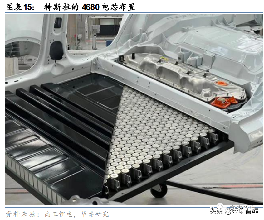 2020 年 9 月“特斯拉电池日”率先发布 4680 电池,在 2021 Giga Fest 上,特斯拉展示了其 将用于 4680 电池的 CTC 技术,4680 等于车身横向布置,2170 的模组是车身纵向布置。2022 年 2 月,特斯拉宣布完成百万个 4680 电芯,顺利实现量产。在 4680+CTC 技术下, 特斯拉直接取消座舱地板,以电池上盖作为替代,座椅直接安装在电池上盖上。