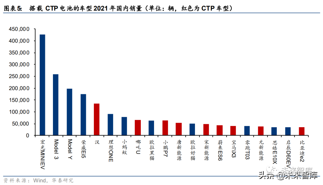 借力 LFP 电池,宁德时代与比亚迪两大动力电池巨头的 CTP 技术已经在 2021 年新能车销 量 TOP 10 中渗透了 4 成。宁德时代 CTP 配套已蔚来 ES6、小鹏 G3、小鹏 P7,还将为蔚 来 ET7、荣威 RES33 及哪吒多款今年上市或未来上市的新车型提供相关技术。比亚迪爆款 车型秦 Plus、汉 EV 和 DM-i 系列也陆续上市,2022 年计划推出不少于 20 款新车,包括汉 DM-i、秦 Plus DM-i、宋 MAX DM-i 等爆款车型的 DMi 版本,2022 年销量挑战 150 万辆。