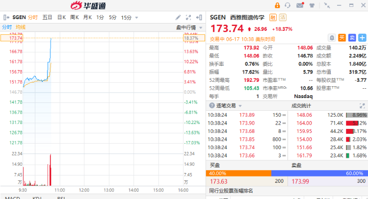 华盛资讯6月17日消息,美股盘中,美国生物技术公司Seagen跳涨超18%,盘中一度触发熔断。据市场消息,默沙东有意收购美国生物技术公司Seagen,其他未透露姓名的收购者也在关注Seagen。