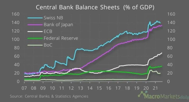 截止去年底,瑞士央行资产负债表已经突破1万亿瑞郎,占GDP比值突破140%,是全球主要央行中杠杆率最高的,而且其中90%以上是外币资产,其中约75%是美元资产,25%为日元和其它类似货币的资产,仅持有不到10%的本国货币资产。维持这种资产负债表结构可以保持对欧盟和美国的低汇率,从而有利于瑞士与欧美的贸易,缺点是这种资产结构很危险,美元兑瑞郎或欧元兑瑞郎每下跌10%,意味着瑞士央行损失近千亿美元,央行必须增发货币从而导致瑞郎贬值。