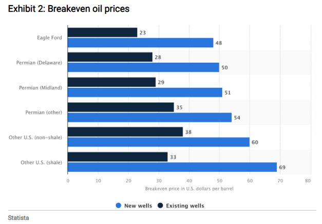 自2016年上一轮油价反弹以来,页岩油的成本结构大幅下降,同时有许多高成本的油气运营商退出行业。页岩油生产商在短短五年内将新油井的盈亏平衡线从2015年的65美元降至2020年的46美元,可见行业效率正在提高。美国新页岩油井的生产成本约为50美元,而现有油井的生产成本约为30美元,所以盈亏平衡价有所不同。不过,市场普遍认为二叠纪盆地油井的盈亏平衡价略高于50美元。