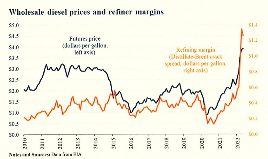 柴油批发价格(黑线 左轴)和炼油商利润率(橙线 右轴)。在寻找高油价罪魁祸首的过程中,白宫又将矛头指向了炼油商。