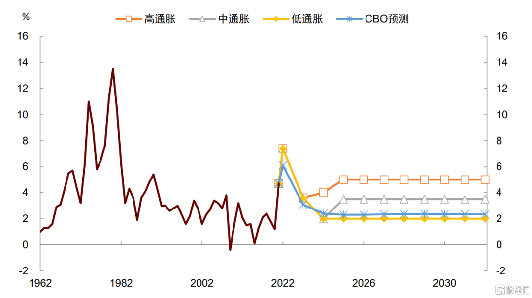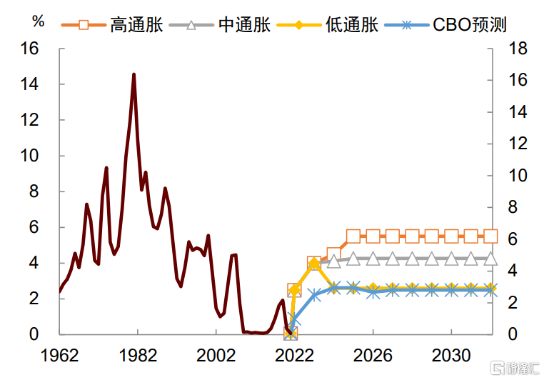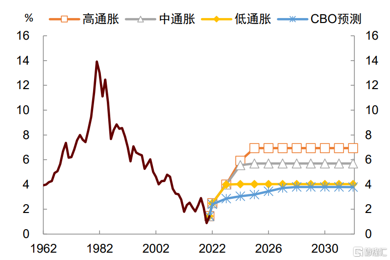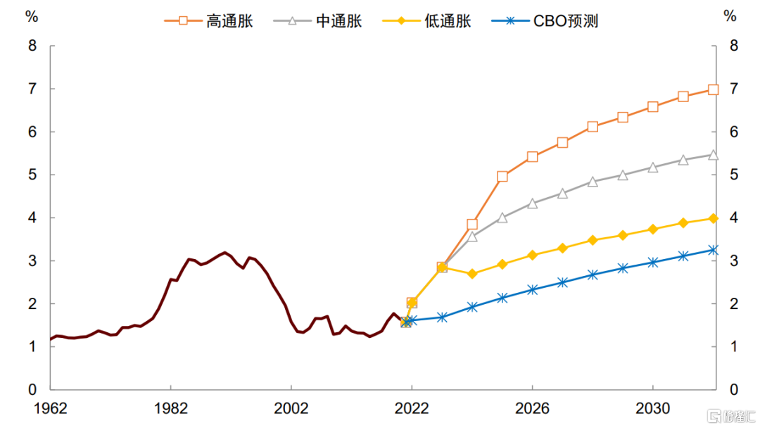 如果上述变化导致通胀抬升,利率中枢也将抬升,这意味着CBO的测算存在低估利率和利息负担的风险。鉴于此,我们有必要重新假设未来“新常态”下的通胀和利率,并对利息支出负担进行新的估计。