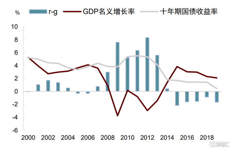 经济文献中的主流观点认为,当利率(r)小于GDP增速(g)时,政府债务就可以实现长期平稳[2]。这里的原理是,只要