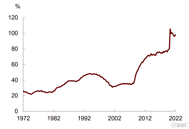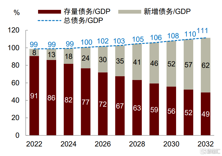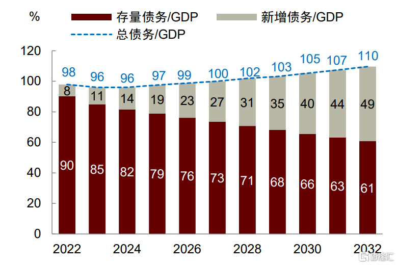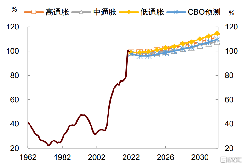 是非利息赤字率。这个式子的经济学含义是,付息率与非利息赤字率之和受到经济增长率的约束。当经济增速下滑时,要想保持债务长期稳定,政府要么压低市场利率水平(如“金融压抑”),要么压缩非利息赤字率(如财政紧缩)。在我们预测的三种情形中, r与 g的水平相差不大,而CBO预测的非利息赤字率也在2~3%左右,基本满足上述条件(图表10)。我们的结果显示,到2032年,低、中、高通胀情形下的比例将分别从当前的99%上升至115%、108%、111%,与CBO预测的110%差别不大[3](图表11)。