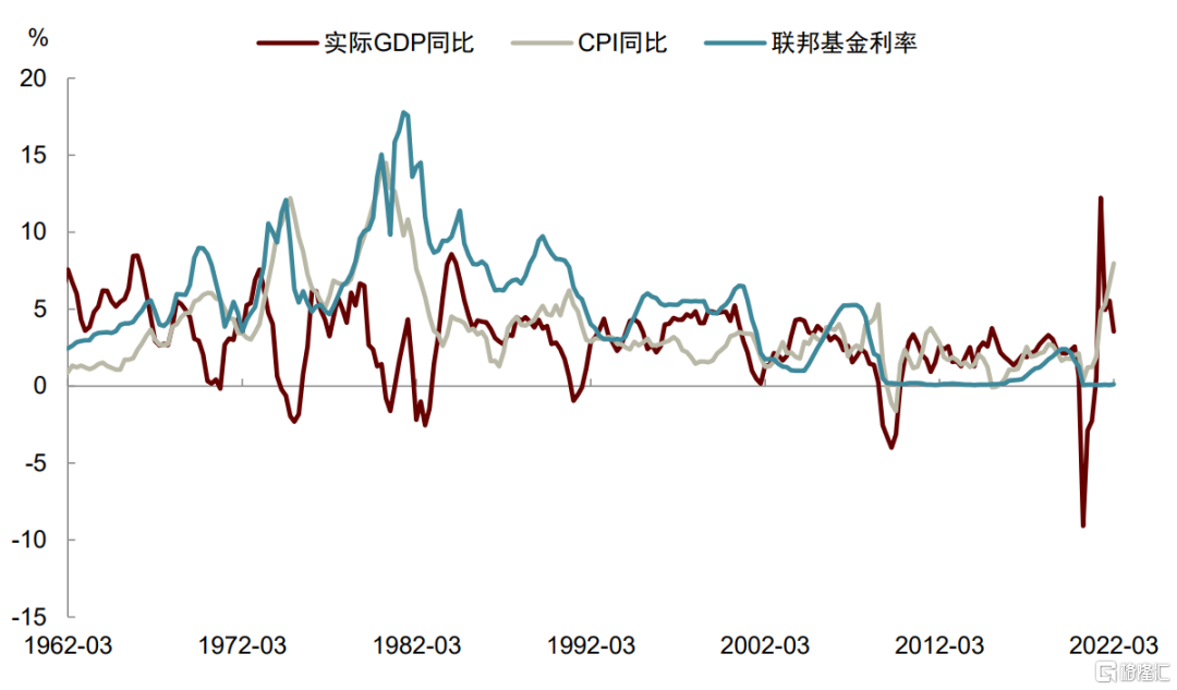 图表19:美国联邦基金利率与GDP增速及CPI通胀