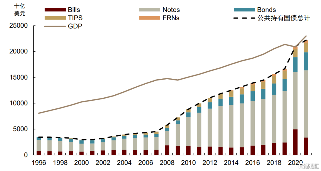 资料来源:CBO,SIFMA,中金研究院,中金公司研究部 注:国库券(Treasury Bills,T-Bills)是美国财政部发行的短期债券,期限不超过一年;国库票据(Treasury Notes,T-Notes)是美国财政部发行的中期债券,期限一般为二至十年;国库债券(Treasury Bonds,T-Bonds)美国财政部发行的长期债券,期限十年以上;通涨保值债券(Treasury Inflation Protected Securities,TIPS)除了拥有一般国债的固定利率息票外,TIPS的面值(本金)会定期按照CPI指数加以调整,以确保投资者本金与利息的真实购买力;浮动利率债券(Floating-Rate Note,FRN) 是指发行时规定债券利率随市场利率定期浮动的债券,也就是说,债券利率在偿还期内可以进行变动和调整。浮动利率债券往往是中长期债券。