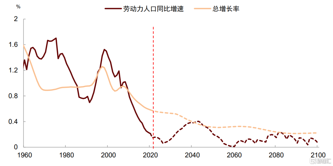 长期来看,GDP增速约等于劳动力人口增速与劳动生产率增速的总和。根据联合国《2019年世界人口展望》预测,美国总人口增长率将从2020年的0.6%下降至2040年的0.4%;15-64岁劳动力人口同比增速也将在波动中下行。