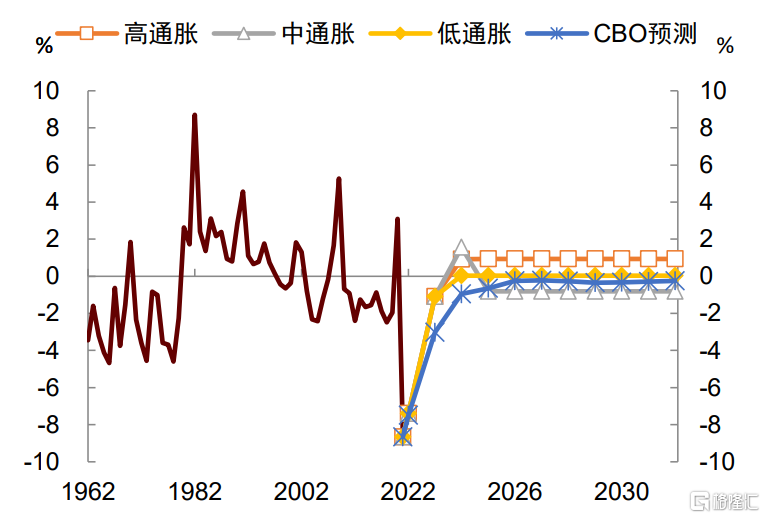 ►低通胀情形:美国经济仍处于低增长、低通胀、低利率的“长期停滞”状态,这与CBO的假设相类似。该情形下,我们预计未来十年美国CPI通胀中枢为2%,实际GDP增速中枢也为2%,联邦基金利率中枢为2.6%,10年期美债收益率中枢为4%。对联邦基金利率的预测是基于其对CPI通胀和GDP增速的线性回归结果。对美债收益率的预测则是在联邦基金利率的基础上加上期限利差。以下情形也采用了这种方法(详见附录二)。