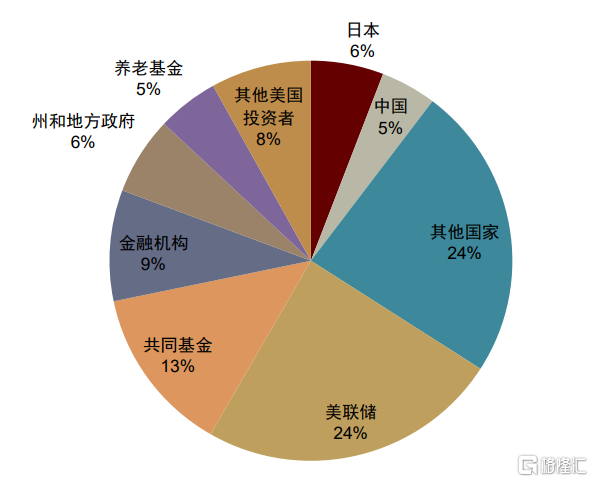 如果美国政府偿债压力上升,风险谁来承担?一种观点认为,美国国债大部分由其国内投资者持有,实际的债务风险有限。2021年底,在公共持有的美国国债中,美联储持有的比例最高,达到24%,其次是美国国内的共同基金(13%)和金融机构(9%),接下来还有州和地方政府(6%)以及养老金(5%)。海外投资者方面,日本(6%)和中国(5%)是主要持有者,其他国家加总持有24%(图表17)。如此来看,美联储及美国州和地方政府确实持有了相当一部分的美国国债。